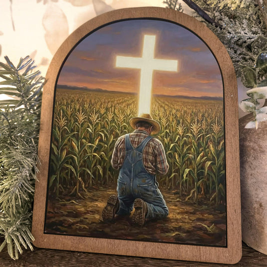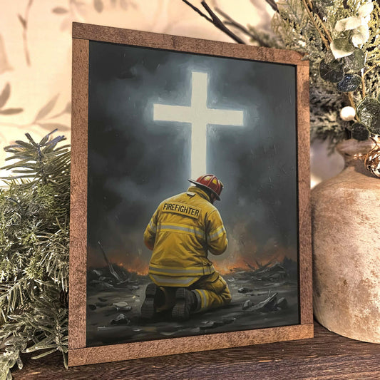 Firefighter Fireman Kneeling Before Cross Framed Art