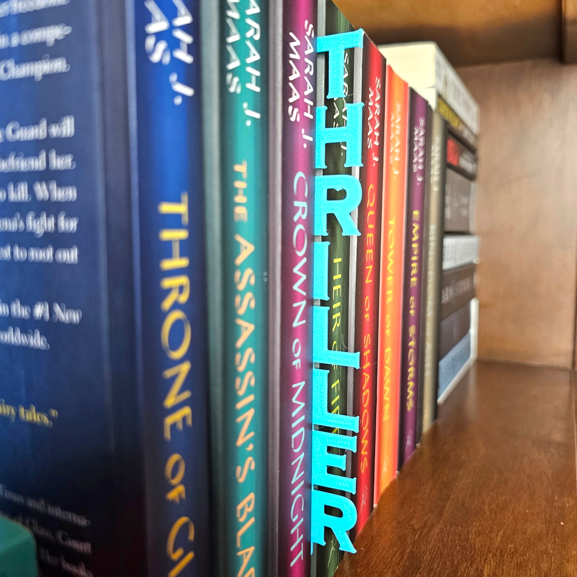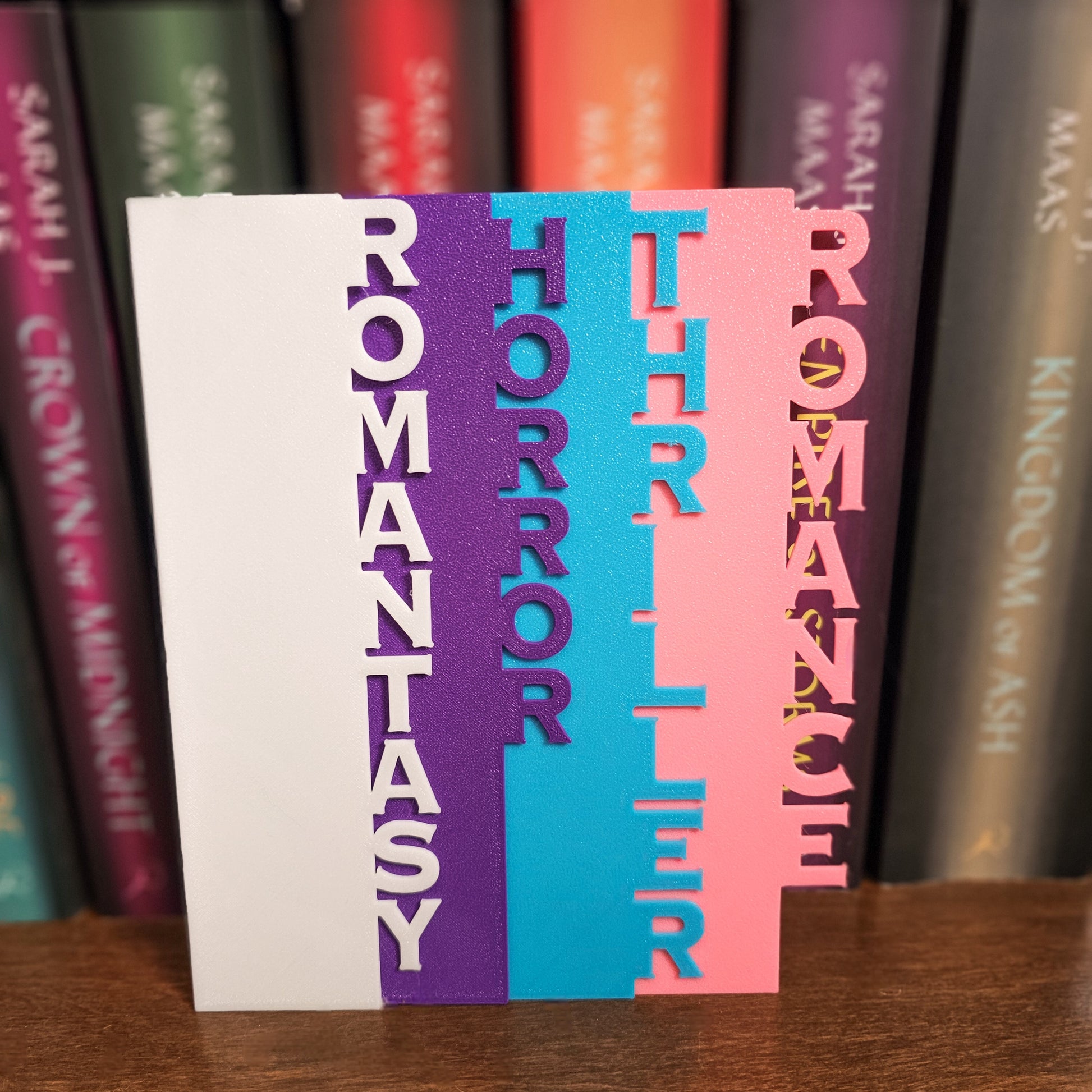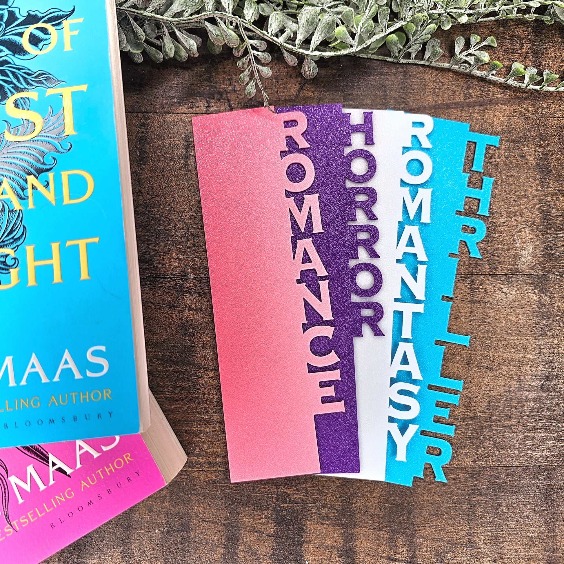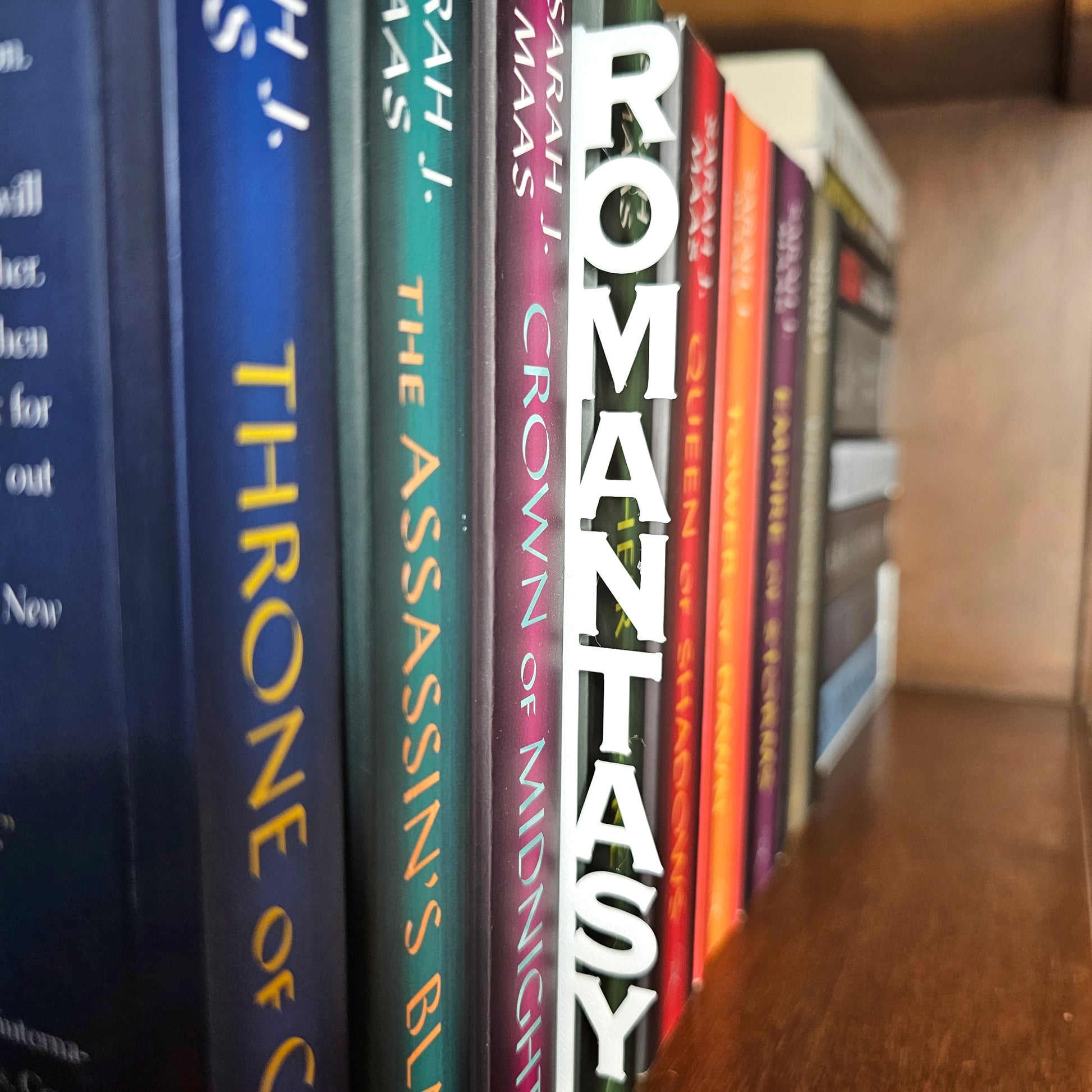 These custom genre separators are perfect for book lovers who want both organization and serious aesthetic vibes. Featuring bold, hollow-cutout lettering in a modern, minimalist style, they spell out the hottest reading categories: ROMANTASY, ROMANCE, HORROR, THRILLER.